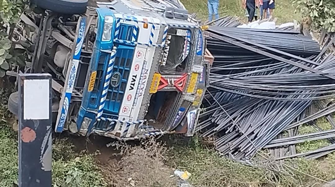 तेज रफ्तार बाइक सवार को बचाते सरिया लोड ट्रक पलटा ,बड़ा हादसा टला