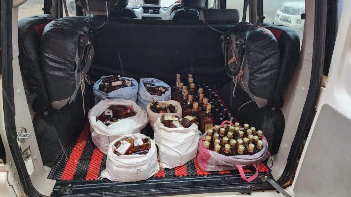 इसी तारतम्य में दिनांक 06.09.2023 की दरम्यानी रात्रि एण्टी क्राईम एण्ड साईबर यूनिट की टीम को सूचना प्राप्त हुई कि चारपहिया वाहन में सवार कुछ व्यक्ति वाहन में शराब रखे है तथा उसे लेकर टाटीबंध से हीरापुर की ओर जा रहे है। जिस पर अतिरिक्त पुलिस अधीक्षक शहर/अपराध श्री अभिषेक माहेश्वरी, अतिरिक्त पुलिस अधीक्षक पश्चिम श्री जय प्रकाश बढ़ई एवं नगर पुलिस अधीक्षक आजाद चौक श्री मयंक गुर्जर (भा.पु.से.) द्वारा थाना प्रभारी कबीर नगर श्री आकाश शुक्ला (भा.पु.से.) तथा प्रभारी एण्टी क्राईम एण्ड साईबर यूनिट को सूचना की तस्दीक कर आरोपियों को शराब के साथ रंगे हाथ पकड़ने हेतु निर्देशित किया गया। जिस पर वरिष्ठ अधिकारियों के निर्देशन में एण्टी क्राईम एण्ड साईबर यूनिट तथा थाना कबीरनगर पुलिस की संयुक्त टीम द्वारा वाहन एवं वाहन में सवार व्यक्तियों को पकड़ने हेतु क्षेत्र में नाकेबंदी करने के साथ ही वाहनों में पेट्रोलिंग कर पतासाजी की जा रही थी। इसी दौरान टीम के सदस्यों द्वारा थाना कबीरनगर क्षेत्रांतर्गत हीरापुर स्थित राम जानकी मंदिर पास मुखबीर द्वारा बताये चारपहिया वाहन को आता देख वाहन को रोकवाने का प्रयास करने पर वाहन चालक वाहन को और अधिक तेजी से चलाकर भाग रहे थे। जिस पर टीम के सदस्यो द्वारा वाहन का पीछा कर वाहन को रूकवाया गया। वाहन में 02 व्यक्ति सवार थे जिन्होने पूछताछ में अपना नाम मुकेश कुमार शाह एवं पवन शाह निवासी हीरापुर रायपुर का होना बताया। टीम के सदस्यों द्वारा उनके वाहन की तलाशी लेने पर वाहन में शराब रखा होना पाया गया। शराब रखने व परिवहन करने के संबंध में दोनो से वैध दस्तावेज की मांग करने पर उनके द्वारा किसी प्रकार का कोई दस्तावेज प्रस्तुत न कर टीम के सदस्यों को लगातार गुमराह करने का प्रयास किया जा रहा था। जिस पर दोनो आरोपियों को गिरफ्तार कर उनके *कब्जे से अवैध रूप से रखे 192 पौवा तथा 14 बॉटल अंग्रेजी शराब तथा शराब परिवहन में प्रयुक्त 01 नग चारपहिया वाहन स्कॉर्पियो क्रमांक सी जी/04/एल डब्ल्यू/7626 जुमला कीमती लगभग 8,40,000/- रूपये जप्त* कर आरोपियों के विरूद्ध थाना कबीरनगर में अपराध क्रमांक 163/23 धारा 34(2) आबकारी एक्ट का अपराध पंजीबद्ध कर कार्यवाही किया गया।