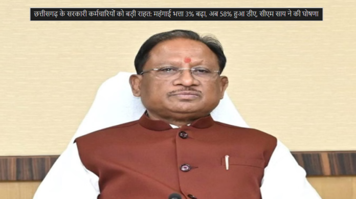 छत्तीसगढ़ के सरकारी कर्मचारियों को बड़ी राहत: महंगाई भत्ता 3% बढ़ा, अब 58% हुआ डीए, सीएम साय ने की घोषणा