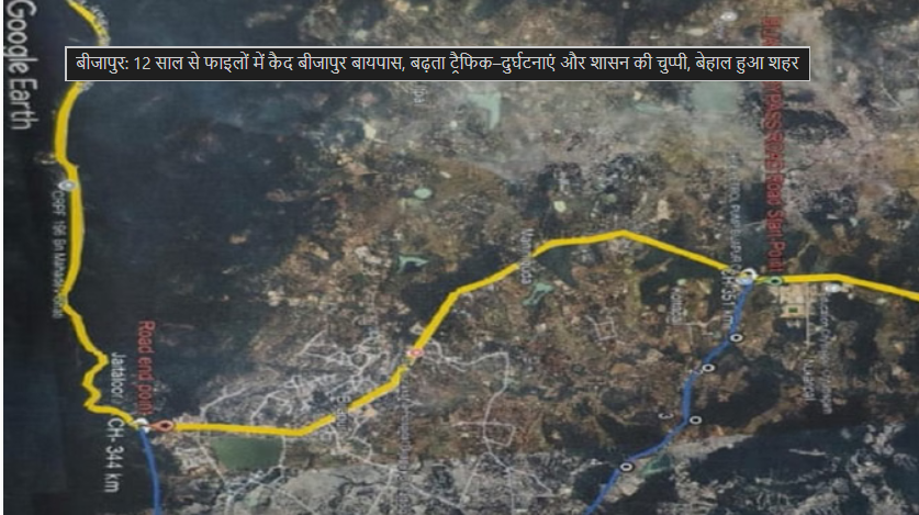 बीजापुर नगर की सबसे बड़ी और बहुप्रतीक्षित जरूरत बन चुकी बायपास सड़क आज भी केवल कागज़ों और फाइलों तक सीमित है। बीते 12 वर्षों से बीजापुर बायपास सड़क का प्रस्ताव सरकारी दफ्तरों में धूल खा रहा है।