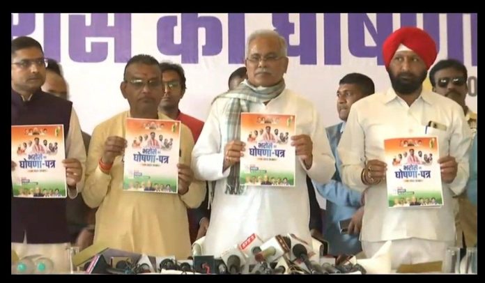 रायपुर। छत्तीसगढ़ कांग्रेस ने “भरोसे का घोषणा पत्र” जारी किया है. घोषणा पत्र में 3200 रुपए में प्रति क्विंटल धान खरीदने, किसानों का कर्जमाफ करने, केजी टू पीजी तक मुफ्त शिक्षा की घोषणा की गई है. इसके अलावा कांग्रेस ने साढ़े 17.5 लाख गरीब परिवार को आवास देने की भी बड़ी घोषणा की है.