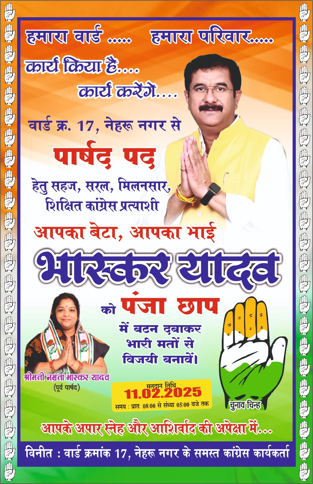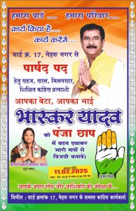 भास्कर यादव का मानना है कि पार्षद का पद सिर्फ राजनीति करने के लिए नहीं, बल्कि जनता की सेवा के लिए होता है। वे हमेशा वार्ड के हर नागरिक के साथ खड़े रहे हैं और आगे भी किसी भी परिस्थिति में उनकी मदद के लिए तत्पर रहेंगे। उनका चुनावी एजेंडा सिर्फ और सिर्फ वार्ड का विकास और जनता की भलाई है।नेहरू नगर वार्ड 17 की जनता को अब एक ऐसा प्रतिनिधि चुनने का मौका मिला है, जो वादों से नहीं, काम से अपनी पहचान बनाएगा। वार्ड की जनता के अपार समर्थन से यह साफ हो चुका है कि इस बार पंजा छाप का परचम लहराने वाला है। जनता की सेवा ही मुख्य उद्देश्य के सिद्धांत पर चलते हुए भास्कर यादव वार्ड की तस्वीर बदलने के लिए पूरी निष्ठा से कार्य करने को तैयार हैं।