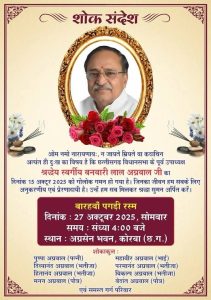 पारिवारिक सूत्रों के अनुसार पगड़ी रस्म 27 अक्टूबर को दोपहर 4 बजे अग्रसेन भवन, कोरबा में आयोजित की जाएगी। इस अवसर पर भाजपा के पदाधिकारी, कार्यकर्ता और नागरिकजन उपस्थित होकर अपने प्रिय नेता को श्रद्धांजलि अर्पित करेंगे।