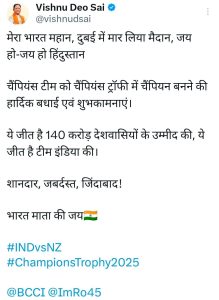 मुख्यमंत्री विष्णुदेव साय ने भारतीय क्रिकेट टीम को चैम्पियंस ट्रॉफी में ऐतिहासिक जीत पर दी बधाई