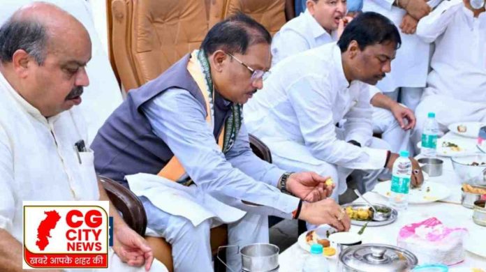 सीएम विष्णुदेव साय ने भाजपा कार्यकर्ताओं को खिलाई भजिया और पताल की चटनी