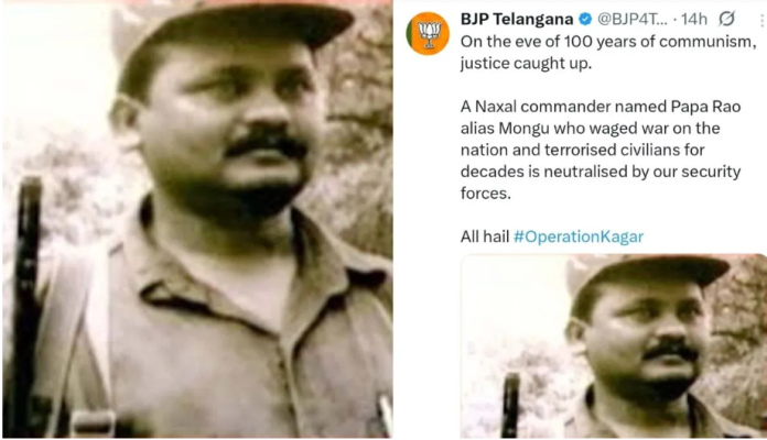 बीजापुर जिले के नेशनल पार्क क्षेत्र में हुई मुठभेड़ के बाद तेलंगाना भाजपा ने दावा किया है कि इस कार्रवाई में शीर्ष माओवादी पापाराव उर्फ मोंगू मारा गया है। भाजपा की तेलंगाना इकाई ने इस संबंध में इंटरनेट मीडिया प्लेटफार्म एक्स पर जानकारी साझा की है।