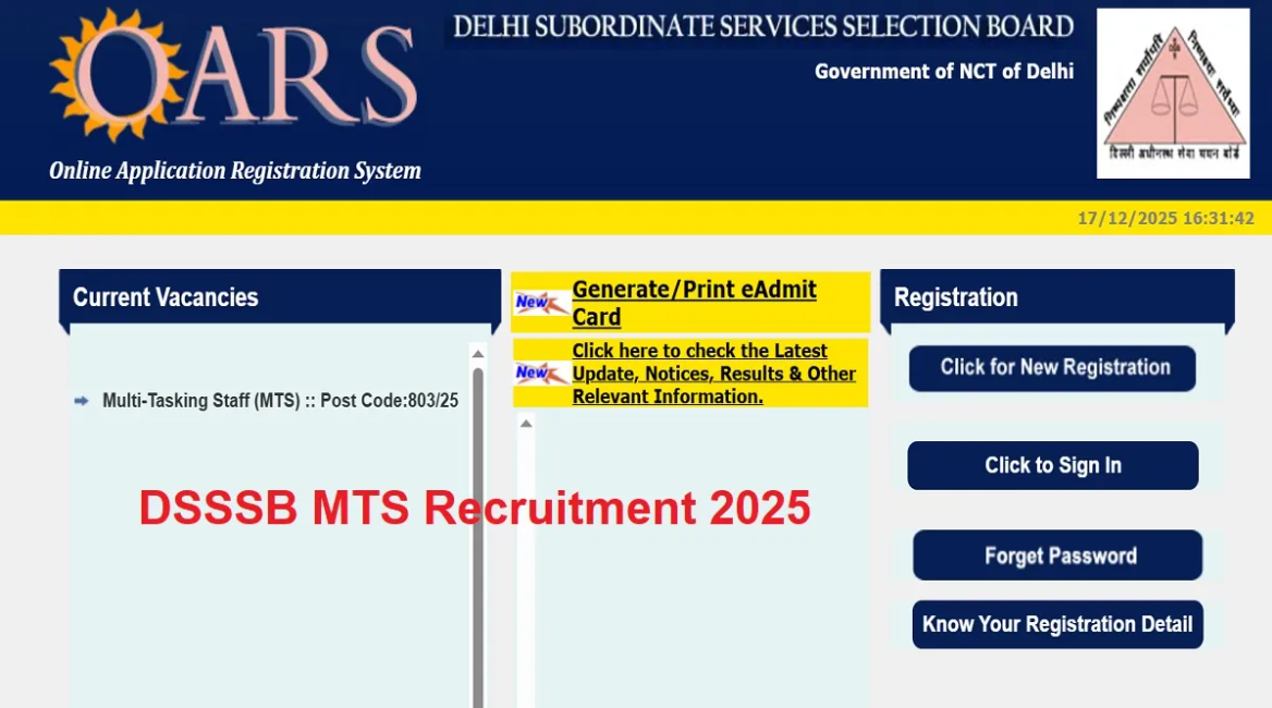 DSSSB की ओर से एमटीएस के 714 रिक्त पदों पर भर्ती के लिए आवेदन प्रक्रिया स्टार्ट हो गई है जो निर्धारित अंतिम तिथि 15 जनवरी 2026 तक जारी रहेगी। 10th पास अभ्यर्थी सरकारी नौकरी पाने के लिए तय तिथियों के अंदर फॉर्म भर सकते हैं।