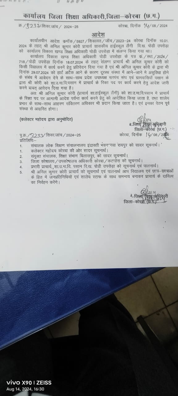 , सरपंच संघ के आवेदन पत्र पर विचार करते हुए जिला शिक्षा अधिकारी कोरबा ने उन्हें शासकीय उच्चतर माध्यमिक विद्यालय पसान में पदस्थ करने संबंधी आदेश जारी किया गया ,
