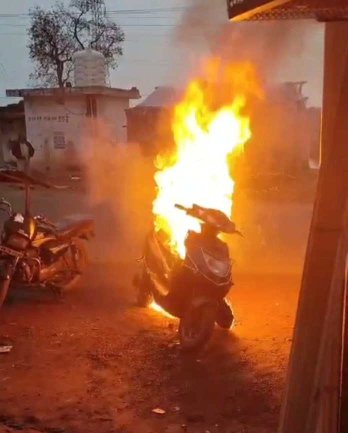 सक्ती/ सक्ती नगर में उसे समय हड़कंप मच गई जब एक स्कूटी में आग लग गई। यह सब कैसे हुआ, इसकी जानकारी नहीं मिली है। जानकारों ने बताया कि स्कूटी के पेट्रोल टैंक के हिस्से में आग का लगा हुआ। जिसके बाद मौके पर काफी ऊंचाई तक आज के शोले भड़कते हुए नजर आए। सबसे सुखद पहलू यह रहा की घटना में किसी भी तरह से जनहानि नहीं हुई है।