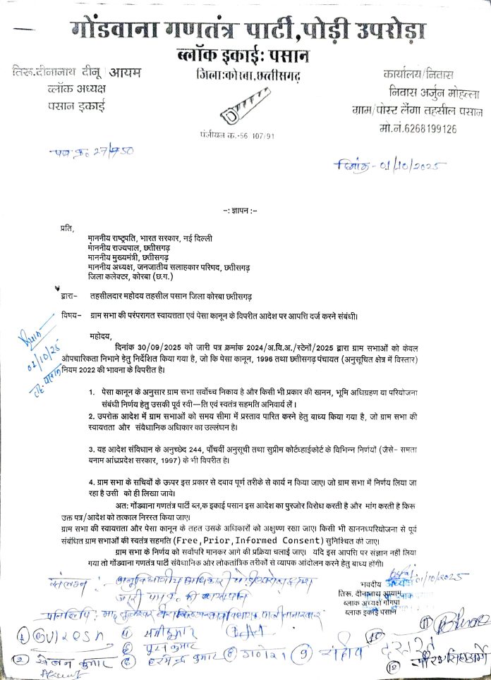 पसान/कोरबा : आज गोंडवाना गणतंत्र पार्टी ब्लॉक इकाई पसान के द्वारा ब्लॉक अध्यक्ष पसान दीनानाथ आयाम के अगुवाई में पसान तहसीलदार श्री वीरेंद्र श्याम को, रूंगटा सांस प्राइवेट लिमिटेड कंपनी चाईबासा को आबंटित कोयला खदान की प्रक्रिया को आगे बढ़ाने के लिए सावधानिक कानूनी प्रावधान को दरकिनार कर अनुविभागीय अधिकारी राजस्व पोड़ी उपरोड़ा द्वारा पेशा एक्ट -1996, एवं पेशा नियमावली छत्तीसगढ़ 2022 के प्रावधानों को नजरअंदाज करते हुए 30 सितंबर 2025 को प्रभावित ग्राम पंचायतों के सचिव को ग्रामसभा में प्रस्ताव ठहराव के लिए निर्देशित किया गया था।उस आदेश के विरुद्ध तहसीलदार पसान को ज्ञापन सौंपा गया और प्रशाशन , रूंगटा सांस प्राइवेट लिमिटेड कंपनी के द्वारा कानून को दरकिनार तानाशाही करने पर जनहित और जल जंगल जमीन को सुरक्षित करने के लिए गोंडवाना गणतंत्र पार्टी सड़क से संसद तक संवैधानिक लड़ाई लड़ने के लिए बाध्य होगी।