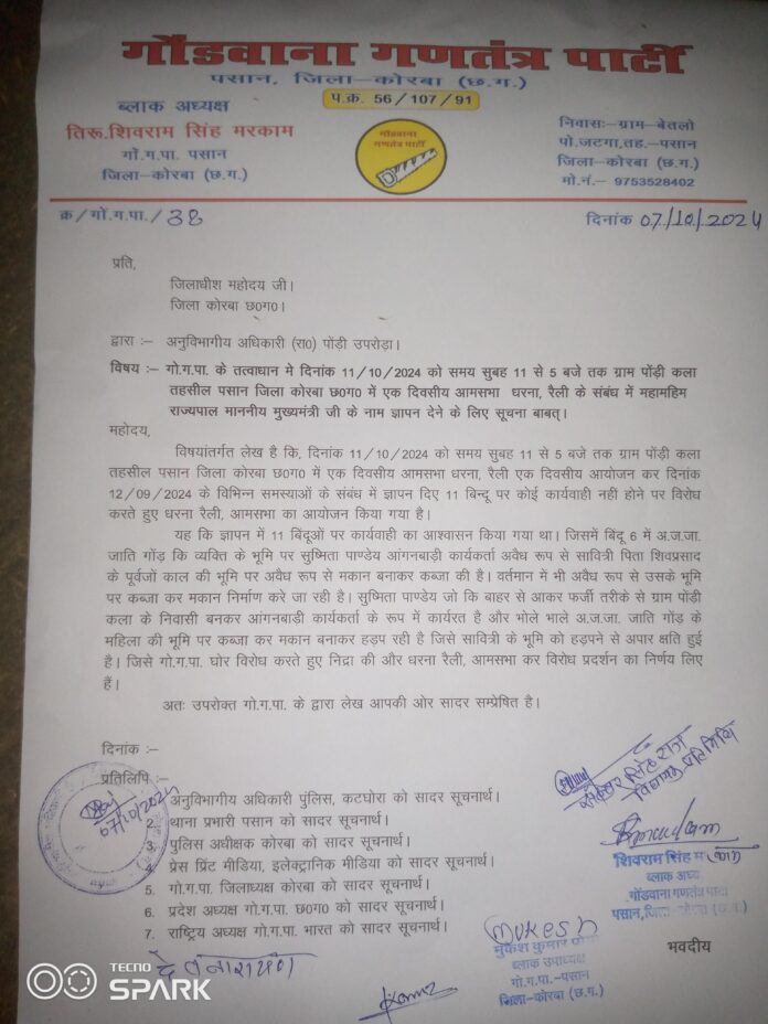 पोड़ी उपरोड़ा / पसान // आदिवासियों के भूमि पर अवैध अतिक्रमण को लेकर गोंगपा ने जताई नाराजगी सुष्मिता पांडे के द्वारा आदिवासियों के भूमि पर अवैध अतिक्रमण ग्राम पोड़ी कला में किया जा रहा है जिस का गोंगपा के कार्यकर्ताओं व ग्राम वासियों द्वारा अनुविभागीय अधिकारी राजस्व को अवगत कराया गया था लेकिन अभी तक करवाई नहीं होने पर गोंगपा के द्वारा ग्राम पोड़ी कला में दिनांक 11,10,2024 दिन शुक्रवार को एक दिवसीय आम सभा रैली कर जंगी प्रदर्शन किया जाएगा व महामहिम राज्यपाल महोदय जी माननीय मुख्यमंत्री छत्तीसगढ़ जी के नाम ज्ञापन दिया जाएगा