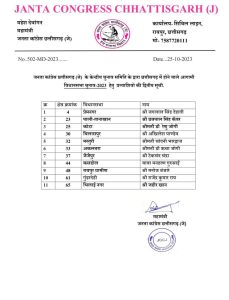 छत्तीसगढ़ विधानसभा चुनाव 2023 के लिये जनता कांग्रेस छत्तीसगढ़ (जे) के 11 उम्मीदवारों की द्वितीय सूची पार्टी की राष्ट्रीय अध्यक्ष एवं चुनाव प्रबंधन समिति की अनुशंसा से आज जारी की गयी है।