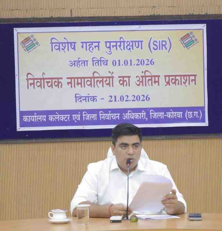 कोरबा, 21 फरवरी 2026/ भारत निर्वाचन आयोग के दिशा-निर्देशों के अनुरूप जिला कोरबा में अर्हता तिथि 1 जनवरी 2026 के संदर्भ में विशेष गहन पुनरीक्षण (SIR) का कार्य सफलतापूर्वक संपन्न कर लिया गया है। आज शनिवार, 21 फरवरी 2026 को कलेक्टर एवं जिला निर्वाचन अधिकारी श्री कुणाल दुदावत की अध्यक्षता में आयोजित बैठक में मान्यता प्राप्त राजनीतिक दलों के प्रतिनिधियों और निर्वाचन अधिकारियों की उपस्थिति में मतदाता सूची का अंतिम प्रकाशन किया गया।