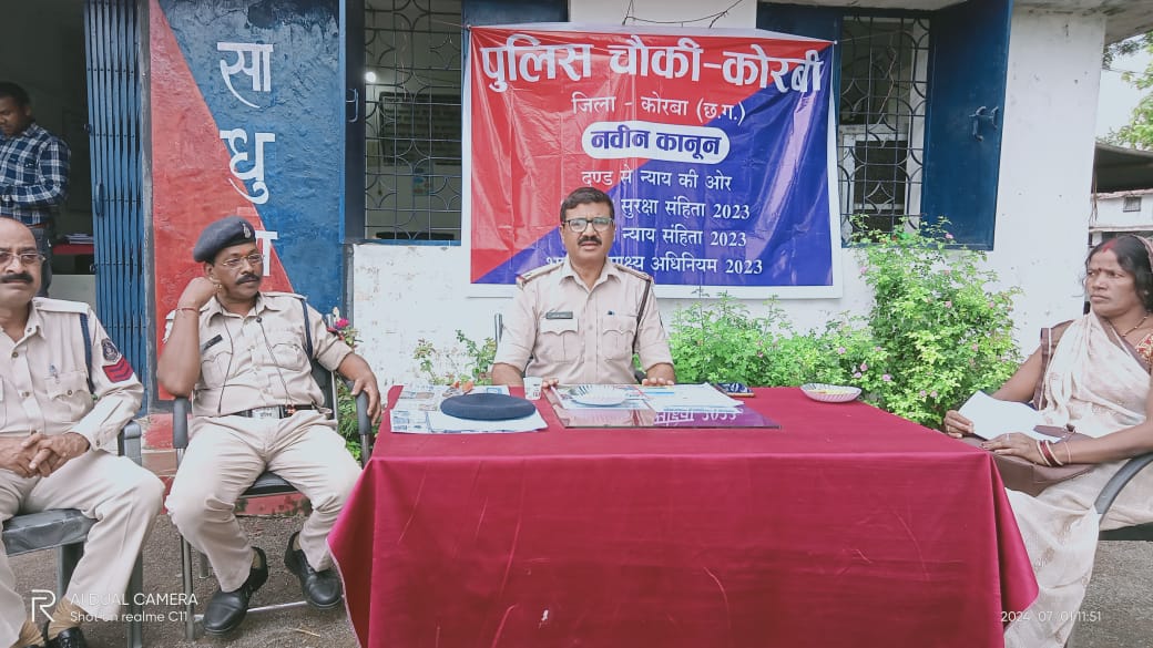 कोरबा // कोरबी चौकी प्रभारी ने किया जागरुकता कार्यक्रम का आयोजन किया। 1 जुलाई से सम्पूर्ण भारत में नए भारतीय कानूनों को लागू किया जा रहा है।भारतीय न्याय संहिता,भारतीय नागरिक सुरक्षा संहिता और भारतीय साक्ष्य अधिनियम,जो 01 तारीख से पूरे देश में प्रवर्तन में आ रहें हैं, इनके संबंध में जानकारी देने,और लोगों को नए कानून विधियों से अवगत कराने कोरबी चौकी प्रभारी अफसर हुसैन खान, प्र.आर. चैन सिंह, प्र.आर. मोहनलाल साहू, आरक्षक विषम नारंग, आरक्षक विक्रम सिंह उइके उपस्थित रहे ।