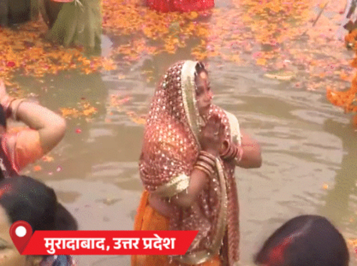 उत्तर प्रदेश के मुरादाबाद में अंतिम दिन सूर्य को अर्घ्य देती महिलाएँ।