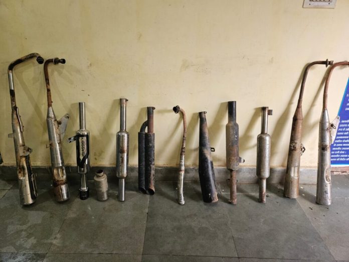 पुलिस ने अमानक साइलेंसर लगाने को लेकर अनेक वाहनों पर की कार्रवाई.. चालको से वसूली गई 8 हज़ार से अधिक की पेनाल्टी.. दुकान से 6 नग अमानक सायलेंसर किया गया जप्त