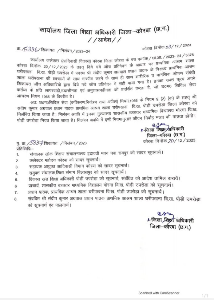 आदिवासी छात्राओं के साथ ये घटना आदिवासी बाहुल्य कोरबा जिला के पोड़ी-उपरोड़ा ब्लाॅक की है। जानकारी के मुताबिक ग्राम घरीपखना में आदिवासी विभाग का प्री मैट्रिक बालिक आश्रम संचालित है। यहां अध्यन्नरत बच्चियां प्राथमिक आश्रम शाला घरीपखना में पढ़ाई करने जाती है। बताया जा रहा है कि पिछले दिनों आश्रम की छात्रा आश्रम शाला में पढ़ने गयी थी। इसी दौरान स्कूल के प्रधान पाठक संदीप कुमार अग्रवाल द्वारा कक्षा पांचवी में पढ़ने वाली छात्राओं के साथ पिकनिक जाने की बात किया जाने लगा। इस दौरान प्रधान पाठक द्वारा कुछ छात्राओं के साथ बैड टच कर उनके साथ गलत काम करने का प्रयास किया गया। जब छात्राओं ने इसका विरोध किया तब बच्चों पर दहशत बनाने के लिए संदीप अग्रवाल ने उनकी जमकर पिटाई कर दी।